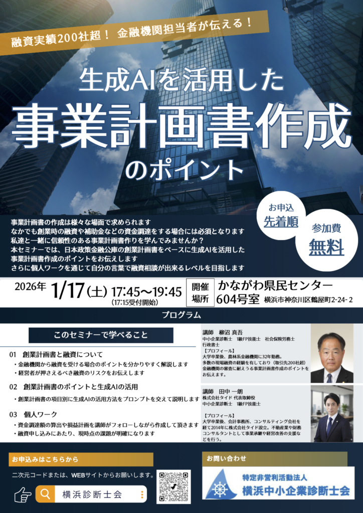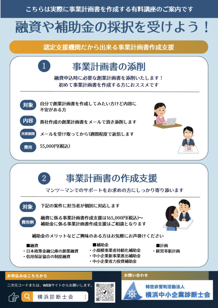 横浜中小企業診断士会では、融資や補助金申請を検討している事業者、創業者向けに